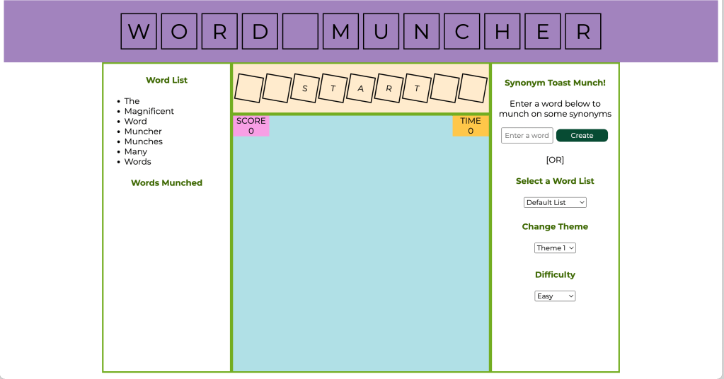Word Muncher is a single page web-game exploring fundamental concepts in javascript, DOM manipulation, API integration, and CSS styling.