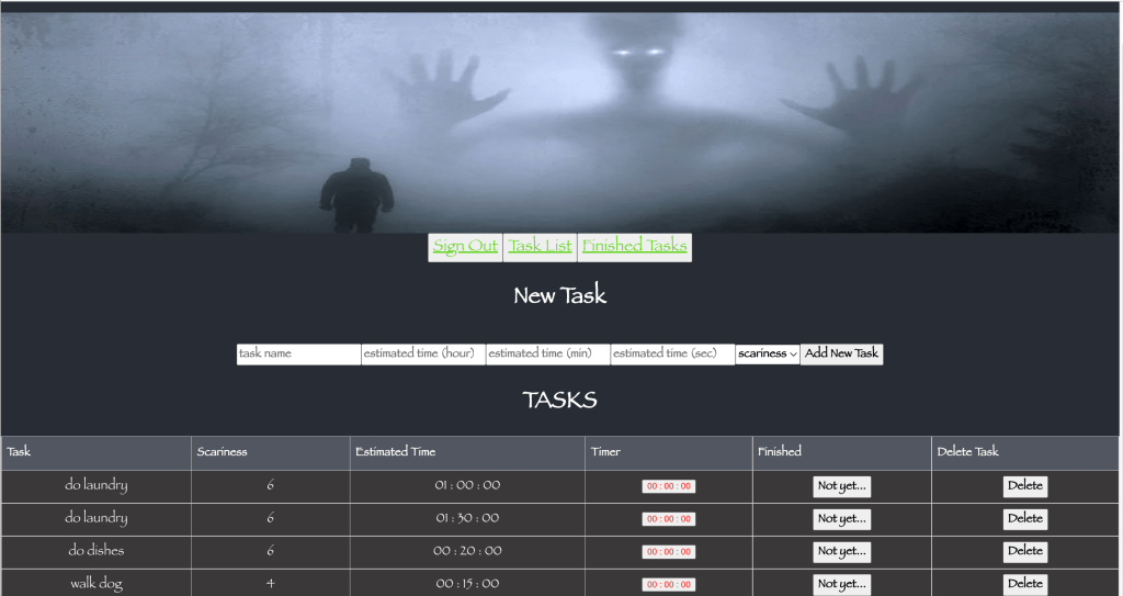 Scary Hour is a full stack productivity app that allows users to create a to-do list modeled on the “Scary Hour” productivity hack popularized by TikTok. Users can create their to do list, which features a description of the task, how long the task is estimated to take, and the “scariness” on a scale of 1-10. Embedded with each task is a timer that users can use to track how long a task ACTUALLY takes to complete. The front-end portion of the project is coded in Javascript and React.