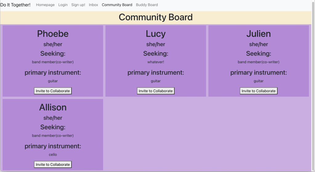 Do It Together is a full-stack social media application for musicians to find other musicians to collaborate with.